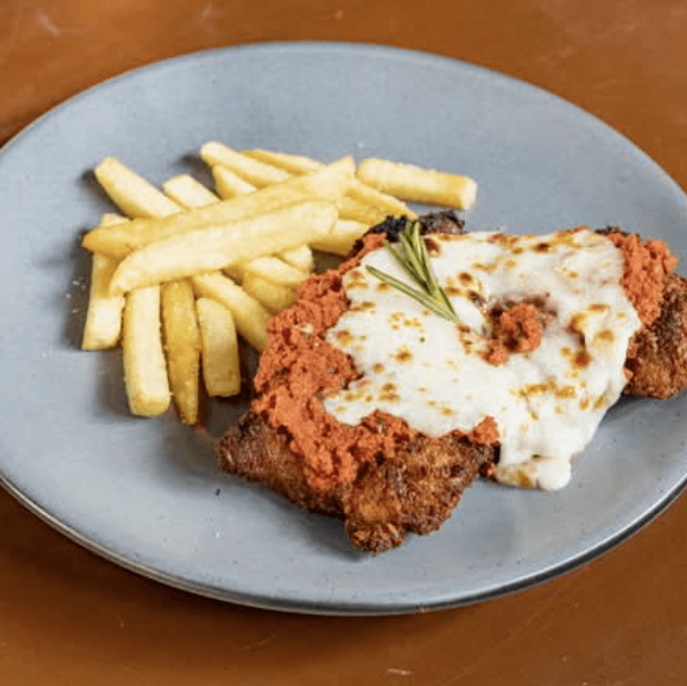 Le robamos al tío Jorge su receta de milanesa de cerdo al mero estilo argentino. Filetito de cerdo empanizado, bañado en una salsa pomodoro y coronado con quesito gratinado. Esta va con papas a la francesa. ¡Saludos tío!.