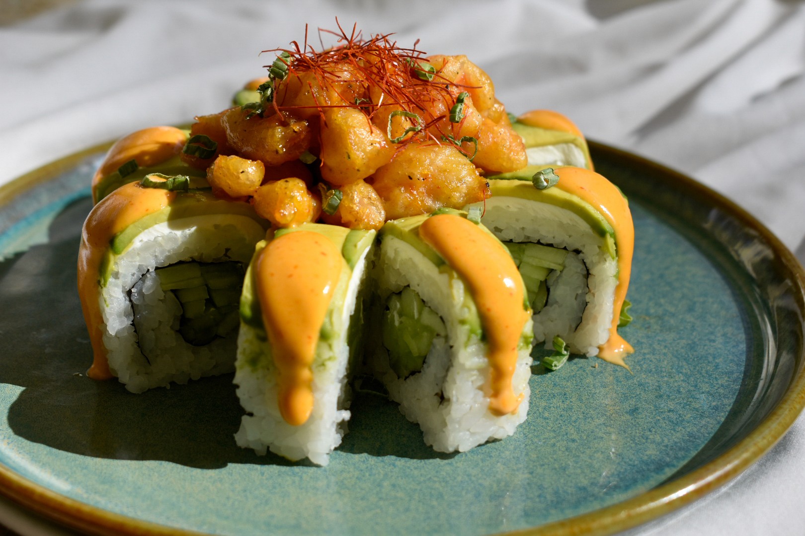 Por fuera crujiente capeado spicy. Por dentro pepino y Philadelphia. Coronado con ensalada de chipotle con camarón y callo.