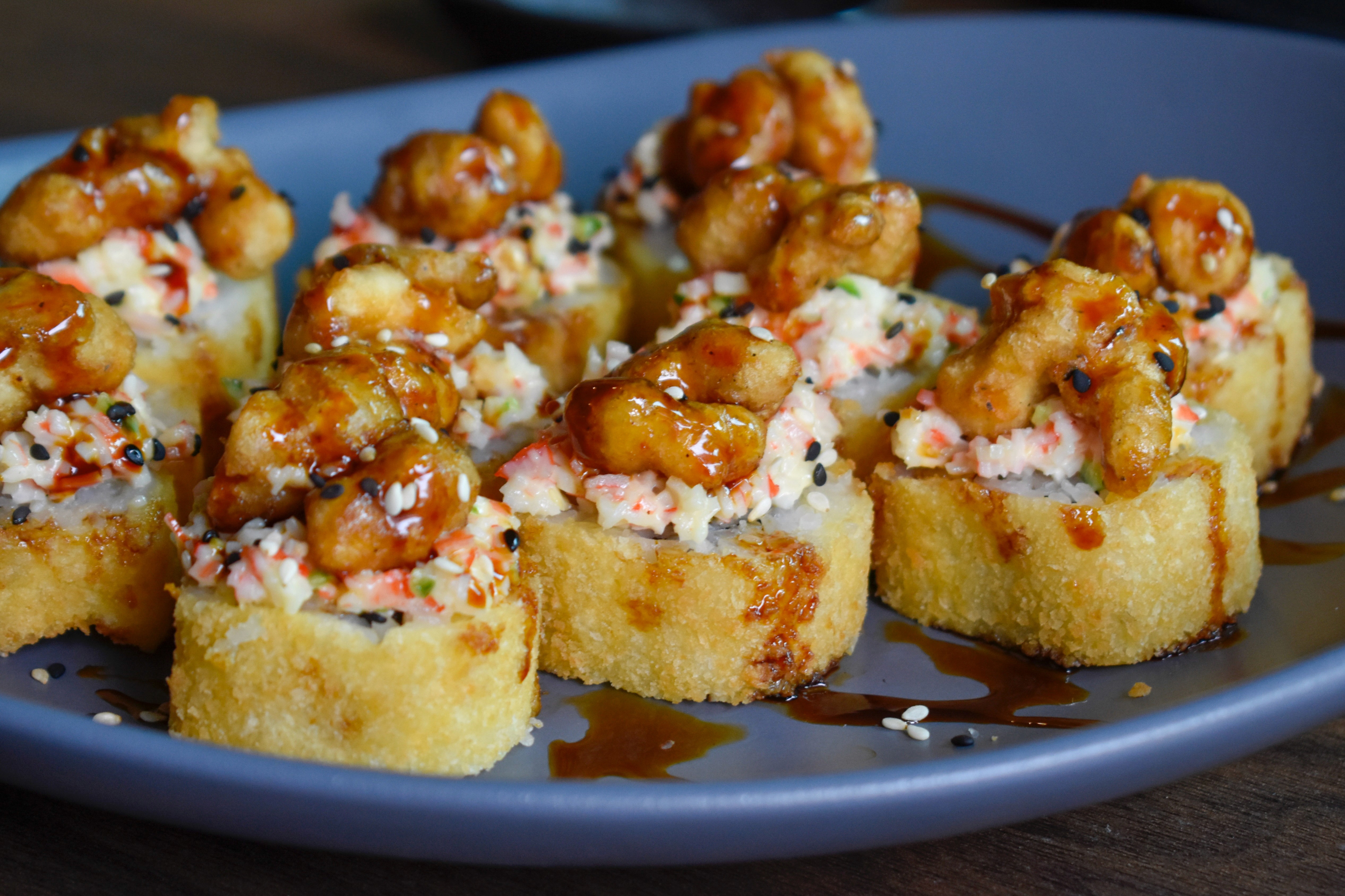 Por fuera Kani, aguacate y Philadelphia. Por dentro pepino. Coronado con aderezo de masago y camarón empanizado.