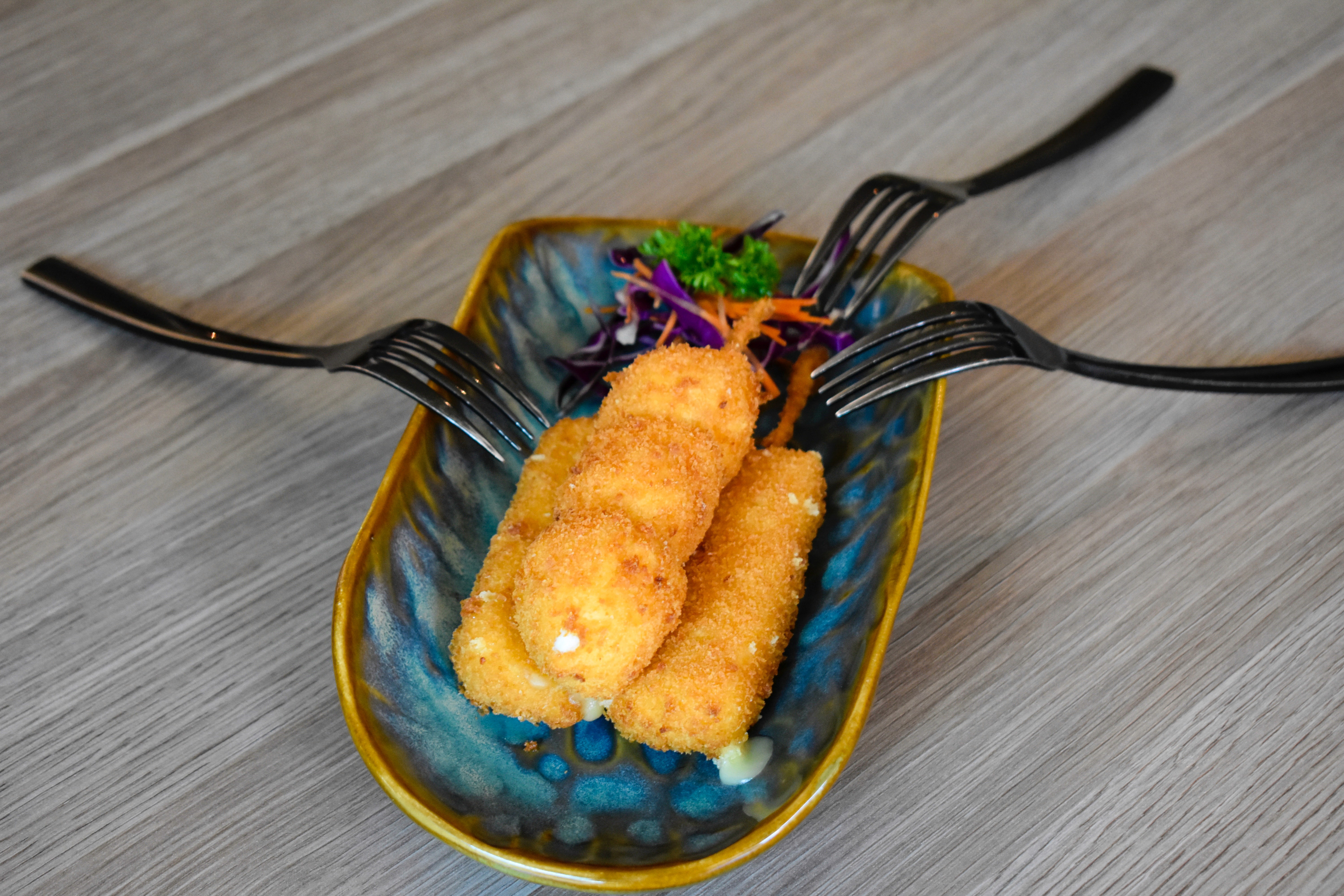 Por fuera queso gouda gratinado con trocitos de chile serrano. Por dentro pepino, camarón empanizado y aguacate.