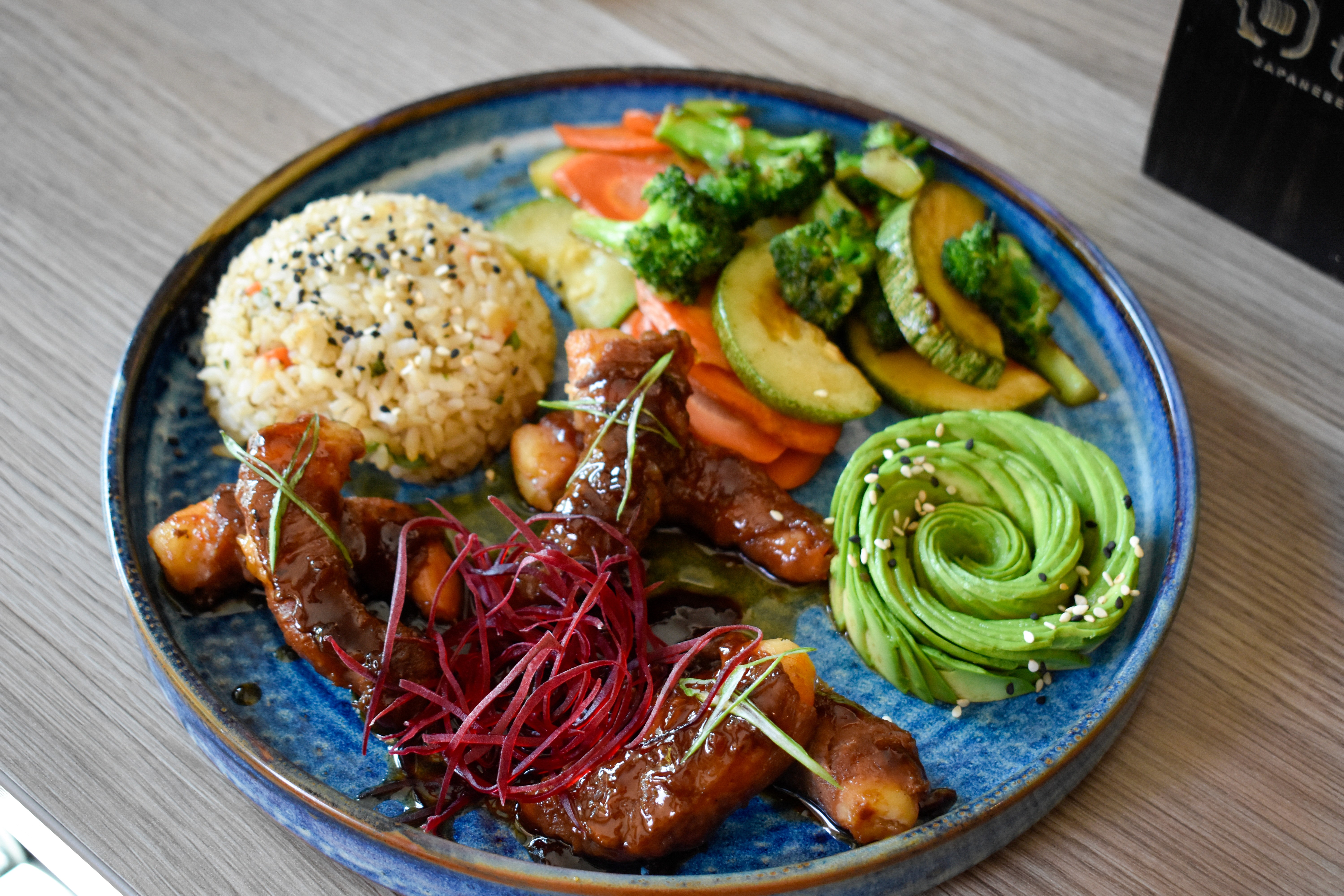 Arroz, ensalada VIP, aguacate y laminas de salmón fresco flameado